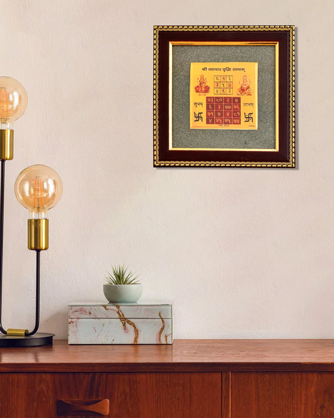 This powerful spiritual décor features the sacred Vypaar Vriddhi Yantra, specially designed to enhance business growth, profit, and financial stability, mounted on a natural raw pyrite stone frame.